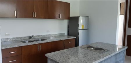Cocina integral con estufa eléctrica, refrigerador, sala de estar, cama matrimonial
