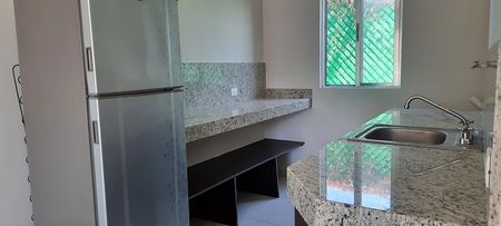 refrigerador, parrilla eléctrica. Baño completo y en la habitación cuenta closet vestido, cama matrimonial, aire acondicionado y abanico de techo. cuenta con cajón para estacionamiento.